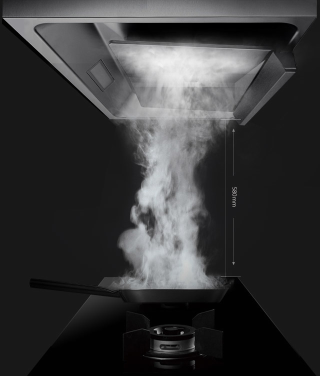 讓我們有了一個絕妙的發(fā)現(xiàn),烹飪時,油煙會有炸起、升騰、擴散三個階段。而距離灶臺580mm黃金控煙區(qū),恰好是油煙升騰和擴散的臨界點, 更是決定吸油煙效果的核心關鍵。