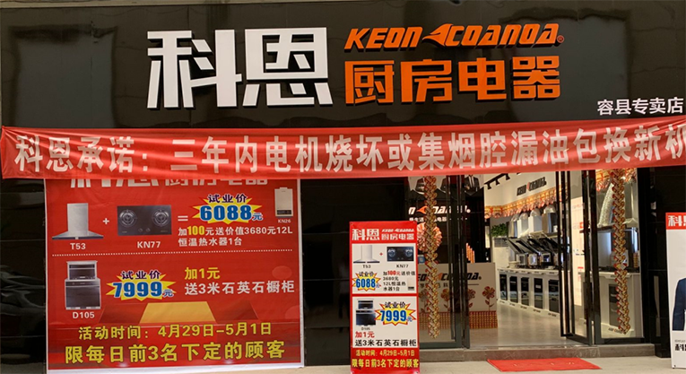 熱烈祝賀科恩廚房電器廣西容縣專(zhuān)賣(mài)店隆重開(kāi)業(yè),國(guó)家高新技術(shù)企業(yè),國(guó)標(biāo)行標(biāo)起草單位,浙江制造標(biāo)準(zhǔn)起草單位,全品類(lèi)廚電制造專(zhuān)家,科恩廚房電器是一家專(zhuān)業(yè)生產(chǎn)高檔吸油煙機(jī)、燃?xì)庠?、消毒柜、集成環(huán)保灶、移動(dòng)凈水器等一體綜合性廚衛(wèi)電器企業(yè)。