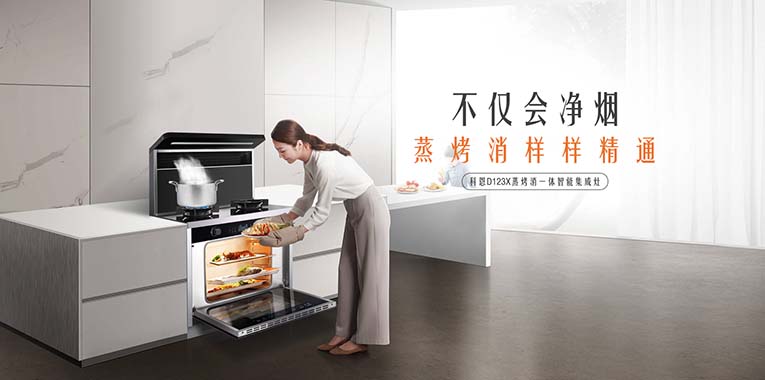 集成灶十大品牌、廚電行業(yè)十大品牌科恩D123X變頻蒸烤消一體集成灶,一臺集成灶=煙機(jī)+灶具+蒸箱+烤箱+消毒柜+1米櫥柜,節(jié)省了80%的廚房電器,讓廚房視野更加開闊。D123X變頻蒸烤消一體集成灶不僅會凈煙,蒸烤消樣樣精通,十大模式30-200℃廣域控溫,噴氣式4D立體蒸+底部陶瓷加熱盤,0-120℃升溫僅需200秒內(nèi)腔頂部兩組加熱管,防止蒸汽上升,頂部不漏水,四面受熱均勻、營養(yǎng)不流失,徹底“蒸”服你的味蕾;智能恒溫烤箱,4D烘烤熱量均勻,操作簡單,200℃高溫烤,邊角位置也能烤到。62L大容積蒸箱,一次蒸多種食物不串味。