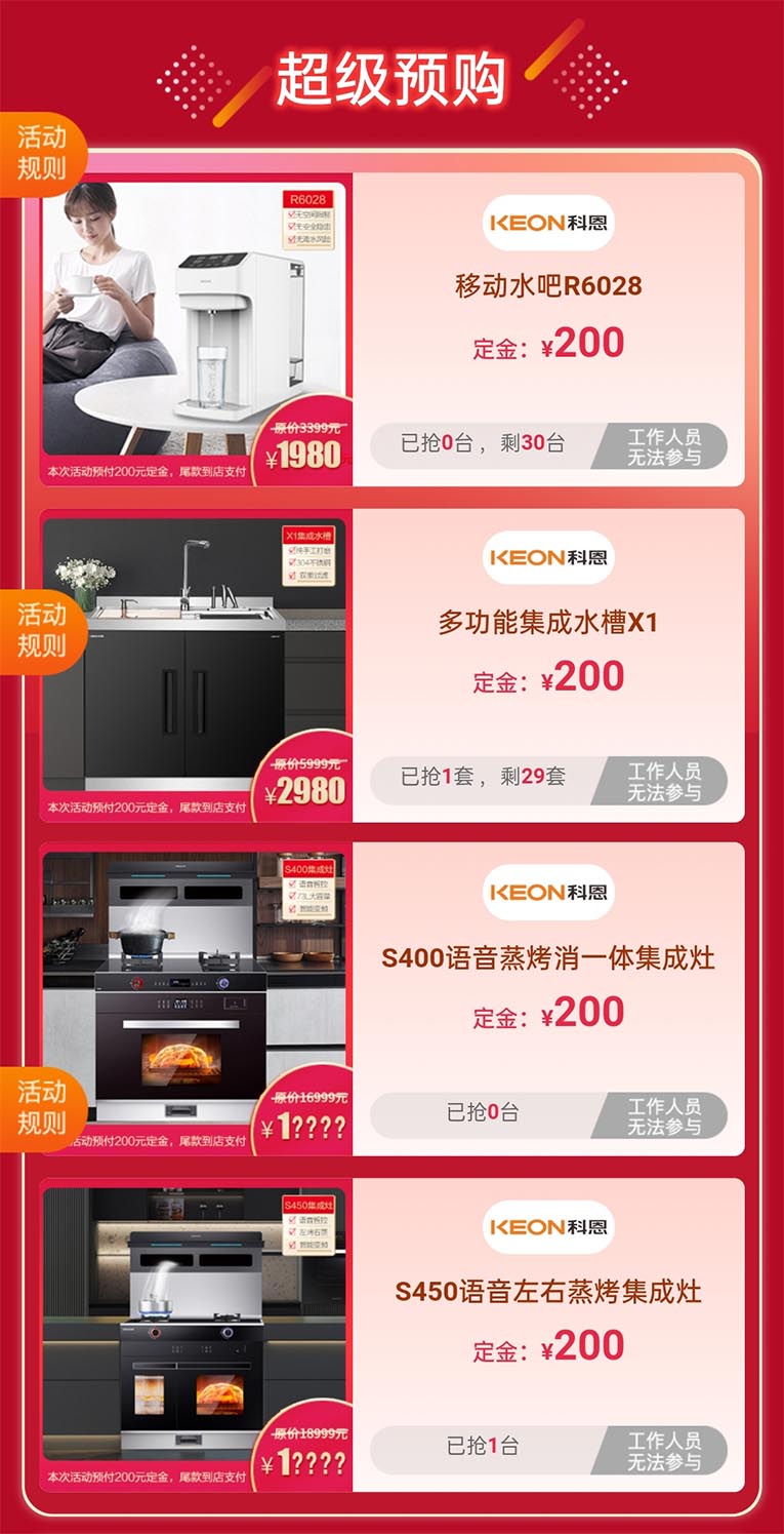 本次超大力度的科恩蒸烤節(jié)活動(dòng)獲得了消費(fèi)者廣泛的參與和關(guān)注,爆款產(chǎn)品加入套餐,助力線下終端門(mén)店銷(xiāo)量騰飛。9.9元特權(quán)卡,限量搶購(gòu),購(gòu)物更省錢(qián),預(yù)付9.9元就能抵用金額200元(無(wú)門(mén)檻),特權(quán)一:享受到當(dāng)?shù)乜贫鏖T(mén)店200元抵扣(特價(jià)機(jī)型除外)、特權(quán)二:享受全國(guó)科恩門(mén)店實(shí)時(shí)優(yōu)惠、特權(quán)三:保價(jià)全年買(mǎi)貴退差價(jià);