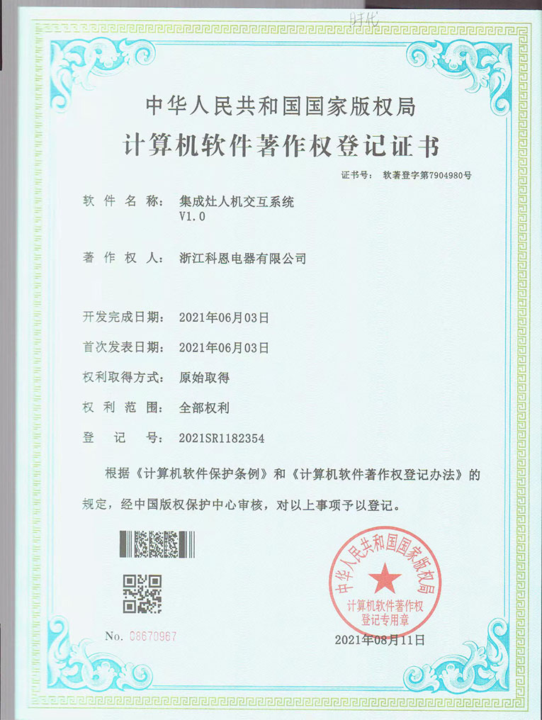 近日,由浙江科恩電器有限公司完全自主研發(fā)的集成灶人機(jī)交互系統(tǒng)V1.0軟件正式獲得國(guó)家版權(quán)局頒發(fā)的計(jì)算機(jī)軟件著作權(quán)登記證書(shū)。計(jì)算機(jī)軟件著作權(quán)是企業(yè)核心自主知識(shí)產(chǎn)權(quán),是企業(yè)的“無(wú)形資產(chǎn)”,是企業(yè)科技的生命力和價(jià)值所在。同時(shí),國(guó)家權(quán)威部門(mén)的認(rèn)證將使搭載這些軟件的產(chǎn)品價(jià)值倍增。此次集成灶十大品牌、廚電行業(yè)十大品牌科恩集成灶獲得計(jì)算機(jī)軟件著作權(quán),充分展現(xiàn)了企業(yè)強(qiáng)大的研發(fā)實(shí)力和核心競(jìng)爭(zhēng)力。