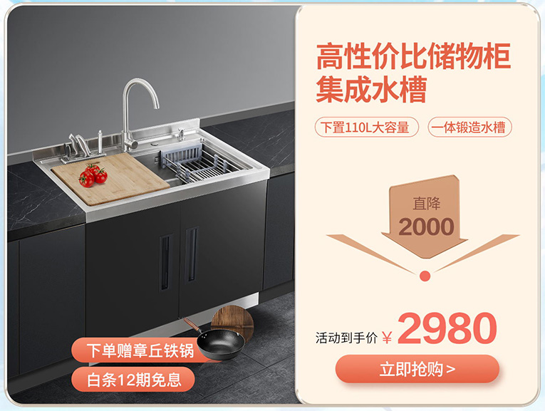 雙11感恩回饋款,多功能一體集成水槽,釋放廚房大空間,科恩X1多功能集成水槽,雙11活動(dòng)期間直降2000,活動(dòng)到手價(jià)2980。