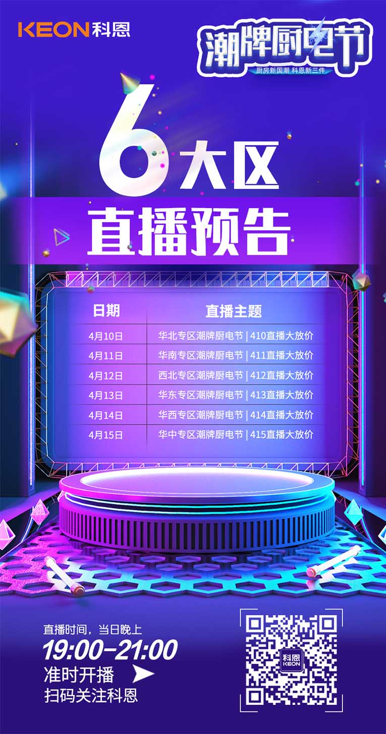 除此之外,為了更好地滿足消費者足不出戶就能選購心儀的集成灶,科恩集成灶#廚房新國潮,科恩新三件#,潮牌廚電節(jié),全國六大戰(zhàn)區(qū)同時發(fā)力,給予貼心服務!