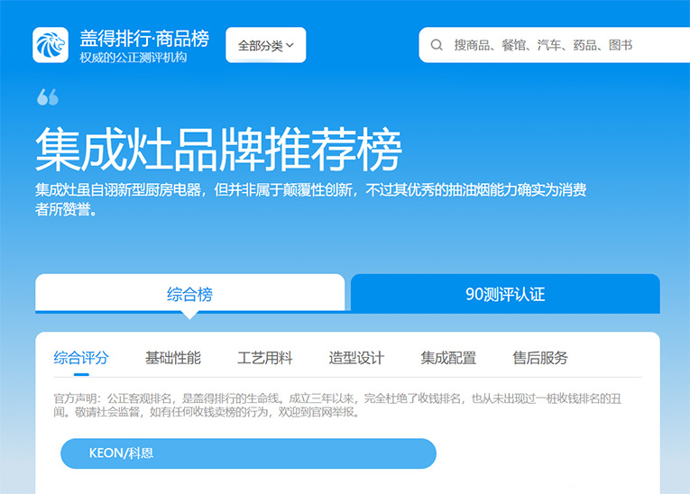 權(quán)威!科恩集成灶榮登蓋得品牌推薦榜!