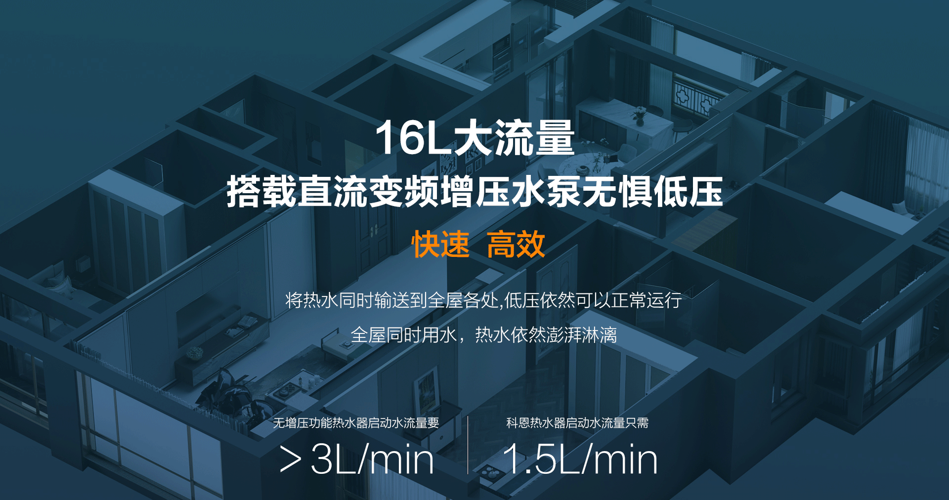 智能增壓,快速高效16L大流量搭載直流變頻增壓水泵,根據(jù)風(fēng)壓智能改變轉(zhuǎn)速,將熱水同時(shí)輸送到全屋各處,低壓依然可正常運(yùn)行,全屋多點(diǎn)用水,熱水依然澎湃淋漓,出水更快,更有效率,別墅、高層完全不帶怕的。