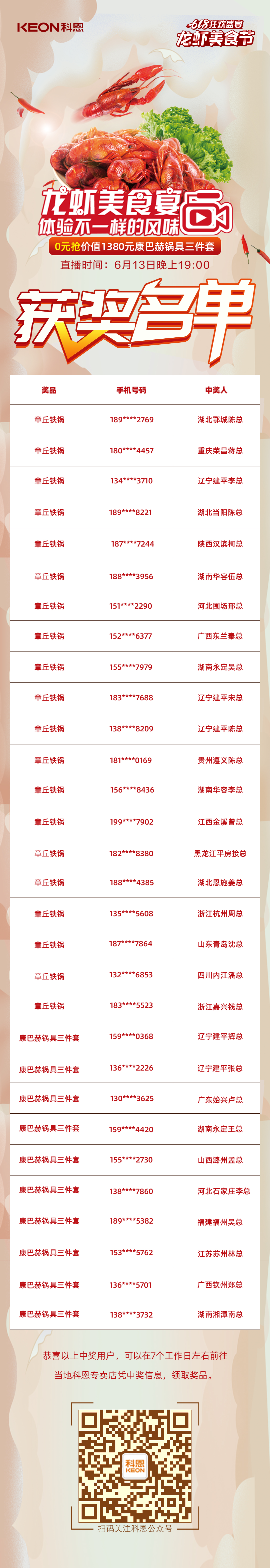為回饋消費(fèi)者的支持與厚愛,科恩集成灶實力寵粉,不僅推出線下龍蝦美食宴活動,更有多輪線上大抽獎活動。這么精彩的龍蝦美食節(jié)直播活動,你參與了嗎?1元薅羊毛的機(jī)會你搶到了嗎?快來看看這期中獎名單,有你嗎?