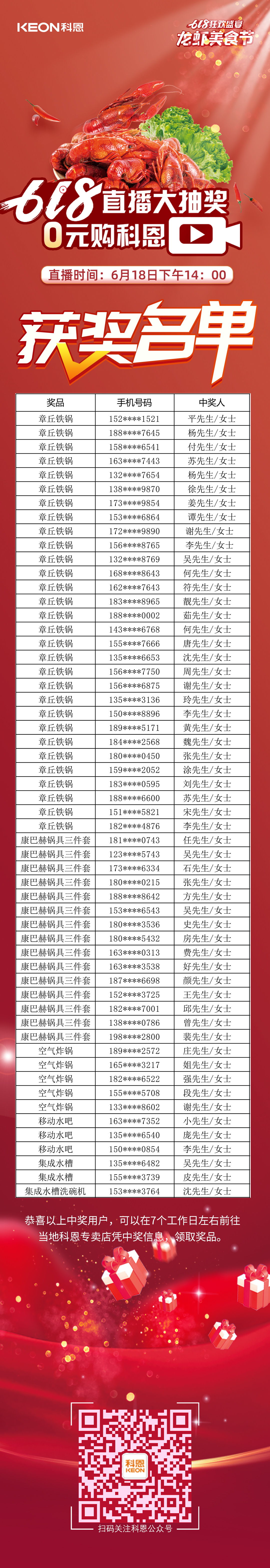 萬(wàn)人品美食,0元搶科恩——科恩龍蝦美食節(jié)圓滿落幕,千城千店,共襄盛舉,感謝大家對(duì)科恩集成灶的大力支持,618直播大抽獎(jiǎng)獲獎(jiǎng)名單火熱出爐,恭喜以上獲獎(jiǎng)的小伙伴們,請(qǐng)盡快聯(lián)系當(dāng)?shù)?a href="http://www.xiezimenhu.com/" target="_blank">科恩門店,快把獎(jiǎng)品領(lǐng)回家吧!