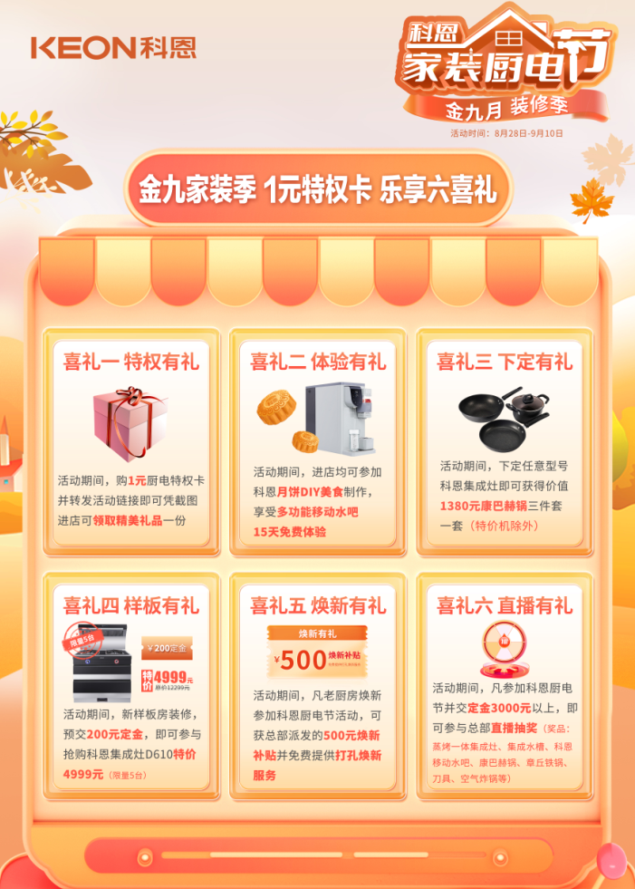 科恩電器早已提前為大家備好了金九銀十家裝好物,寶劍出鞘正待此時(shí),【金九科恩家裝廚電節(jié)】即將火爆開啟,你要的優(yōu)惠、美食、直播、大獎(jiǎng),全在這里!更多驚喜,只等你來全國各大科恩專賣店一探究竟!