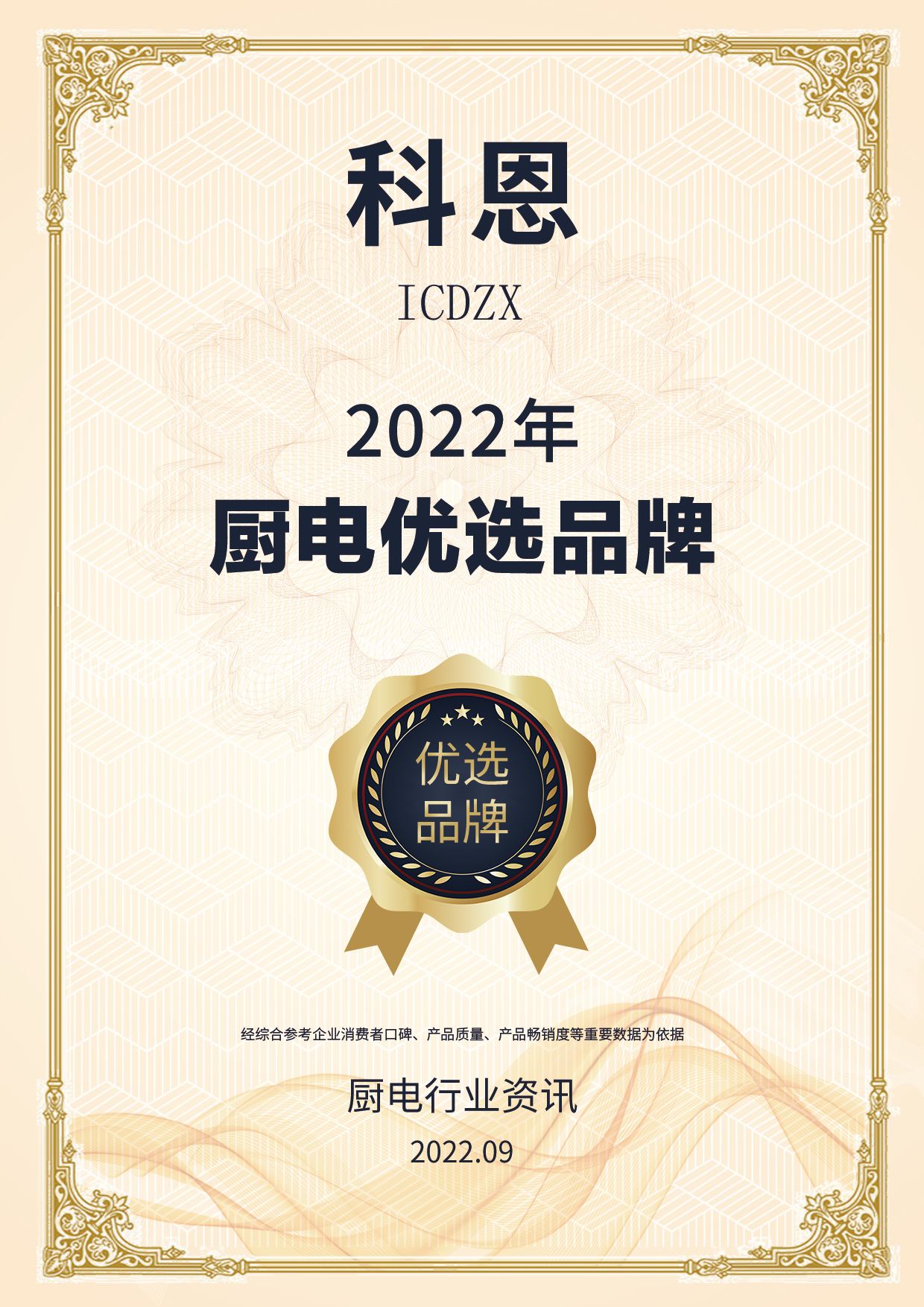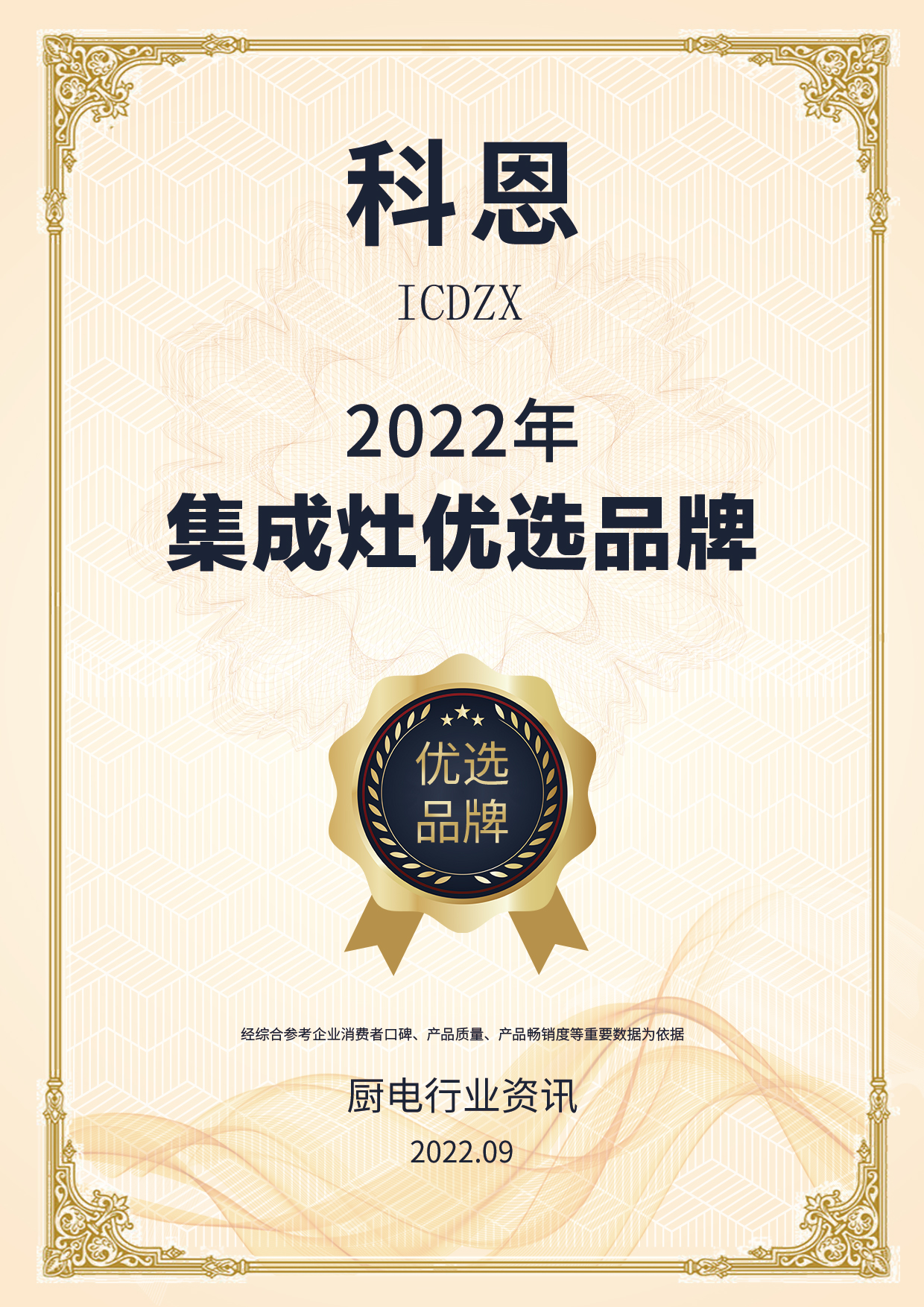 喜報!喜報!喜報!浙江科恩電器有限公司榮獲2022年度質(zhì)量月廚電行業(yè)|集成灶行業(yè)優(yōu)選品牌兩項(xiàng)殊榮!