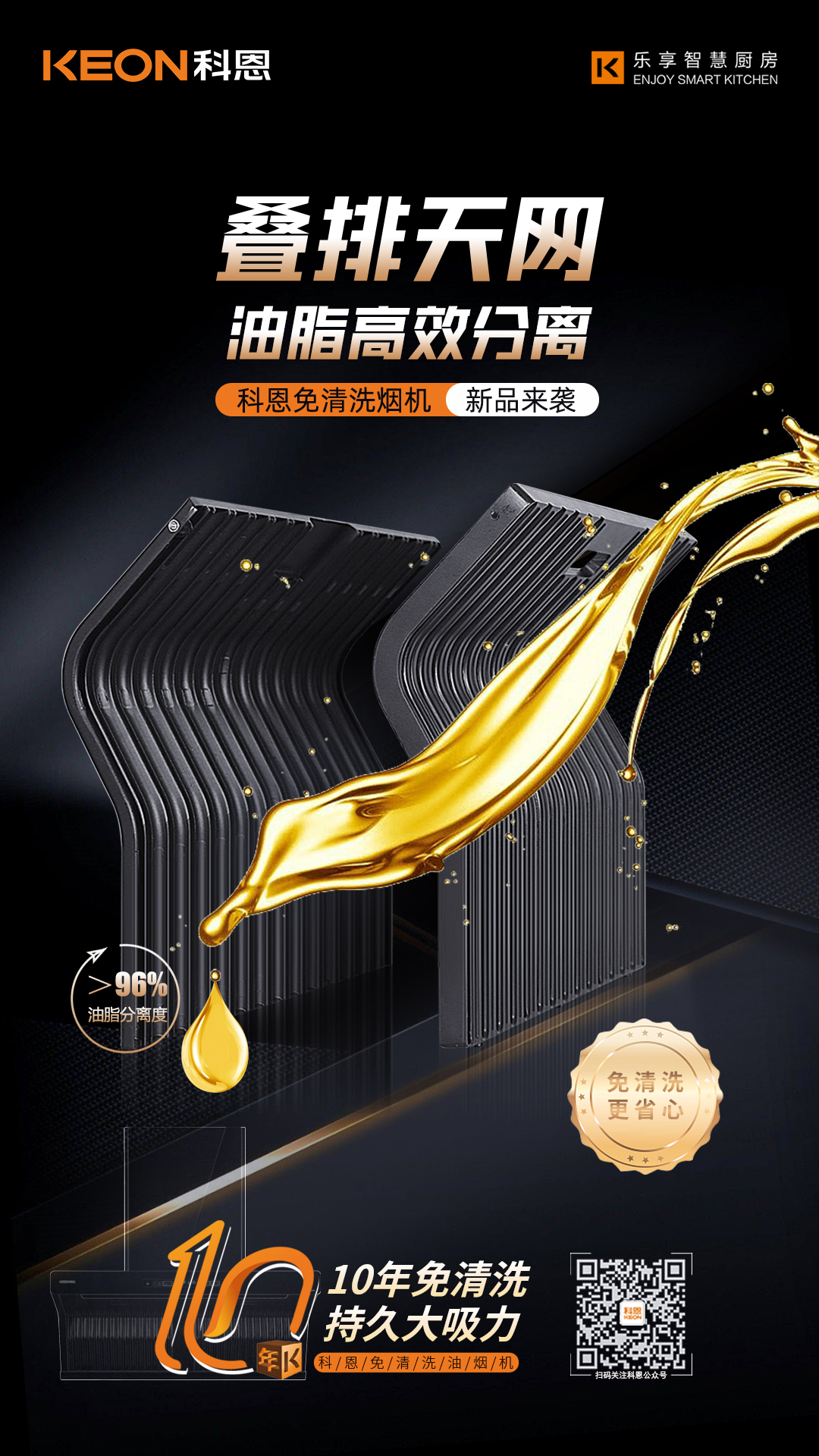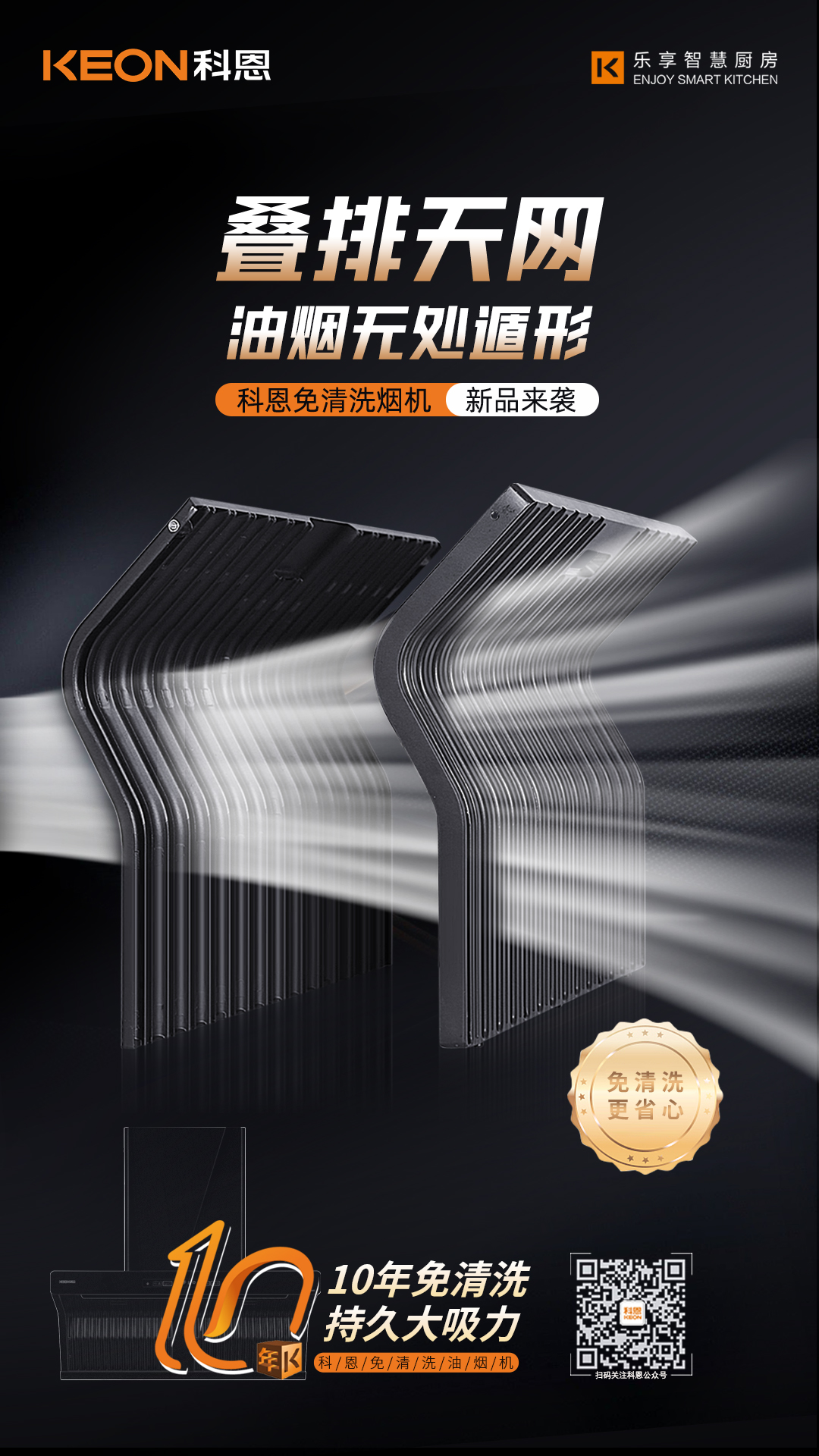 科恩電器歷時3年研發(fā)雙效疊排天網(wǎng),采用易潔太空壓鑄鋁材,經(jīng)過酸洗-噴砂工藝加之特氟龍噴涂最后高溫?zé)Y(jié),不僅不沾油、易清潔更好打理。同時,能好的阻燃阻熱!雙效疊排天網(wǎng)將油煙盡數(shù)隔離在外,真正做到只吸煙不吸油。徹底告別煙機清洗難題。十年免拆清洗,持久大吸力!終于一款替代人類清洗煙機的廚電產(chǎn)品即將面世,讓廚房生活不再油污滿地。