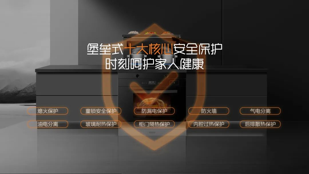 熄火保護、童鎖安全保護、防漏電保護、防火墻、氣電分離、油電分離、玻璃耐熱保護、柜門隔熱保護、內(nèi)腔過熱保護 、后排散熱保護。十大安全防護,保障烹飪安全!