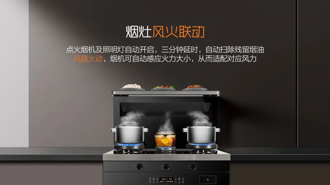 同時,A3在煙灶聯(lián)動功能上做了升級。A3系列打開灶具的同時煙機與照明燈同時打開開啟,且煙機可根據(jù)火力大小自動調(diào)節(jié),無需再手動調(diào)節(jié),風隨火動廚房更智能。