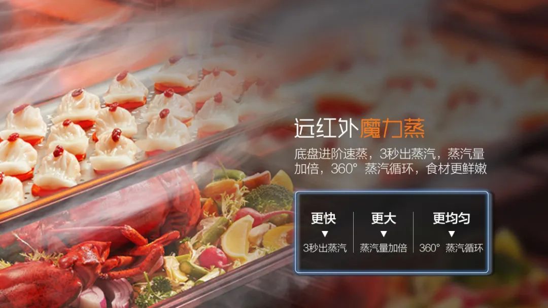 遠紅外魔力蒸:底盤進階速蒸,3秒出蒸汽,蒸汽量加倍,360°蒸汽循環(huán)