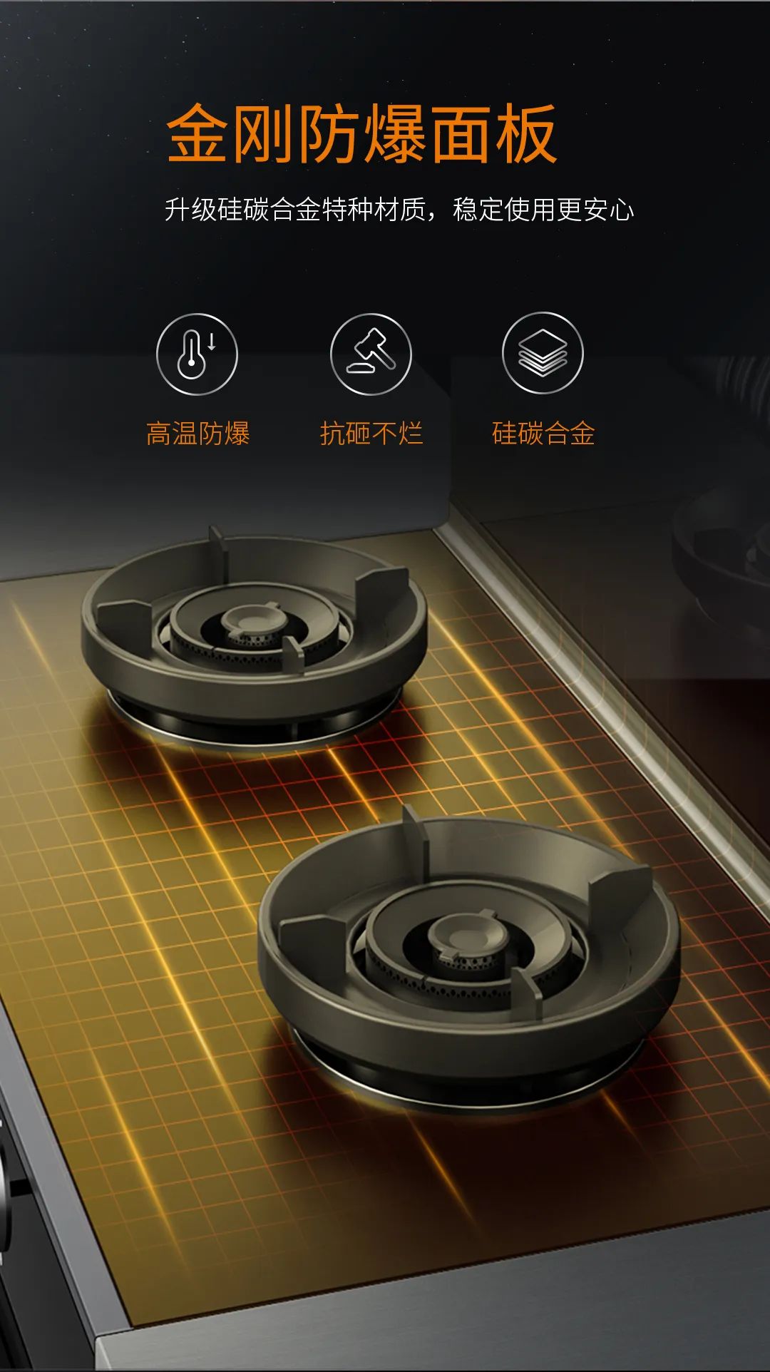 6K省心超體驗一:抗砸防爆耐高溫,安全省心!防爆免清洗集成灶采用防爆金剛板解決廚房安全隱患!硅碳合金特種材質(zhì)可耐高溫1500℃,高于國標(biāo)3倍以上,更安全!