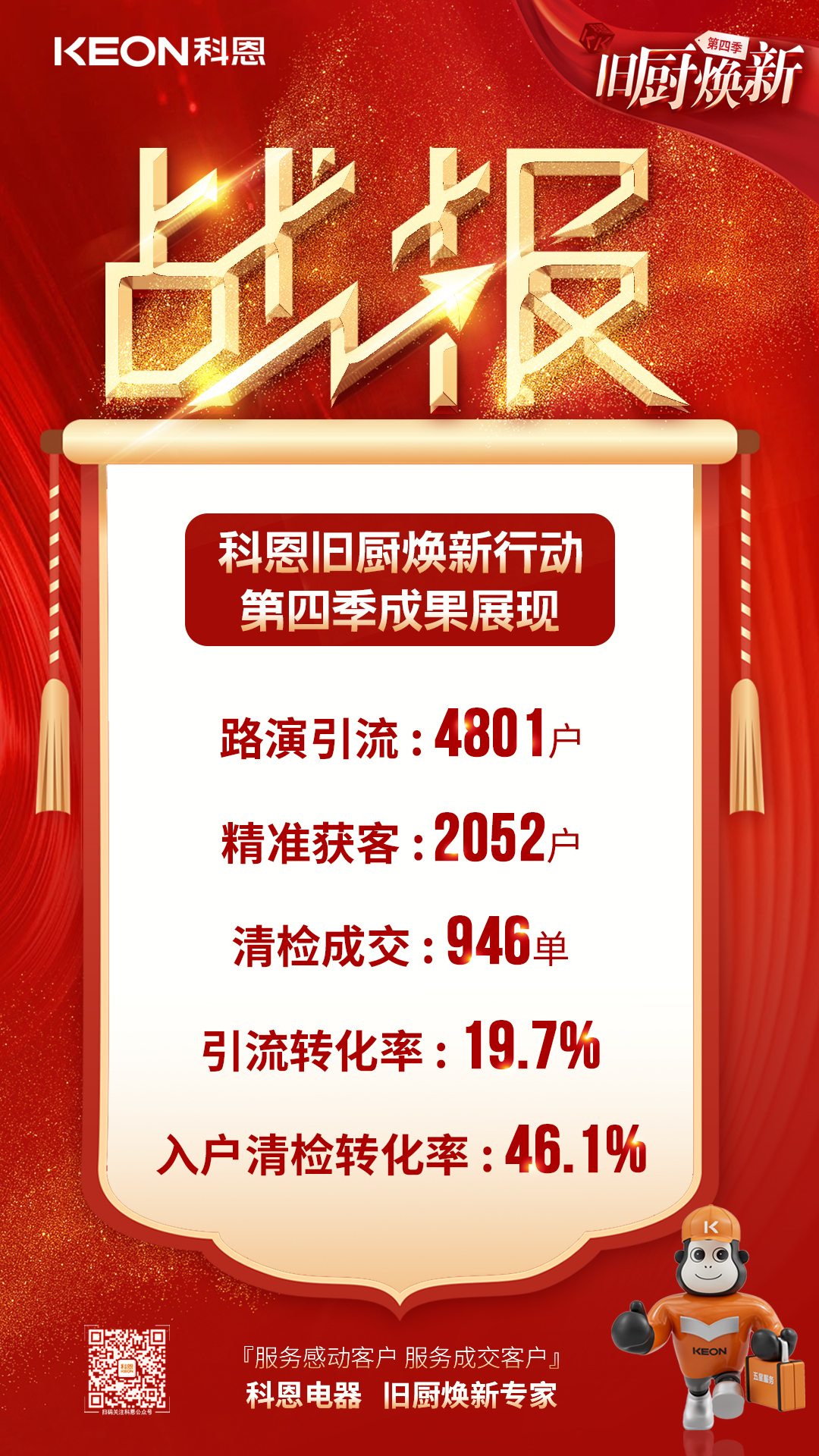 時(shí)至今日,為期20天的科恩“第四季舊廚煥新”活動已然結(jié)束。本次煥新活動路演精準(zhǔn)引流4801戶,成交946單!轉(zhuǎn)化率高達(dá)46.1%!堪稱行業(yè)佳績!
