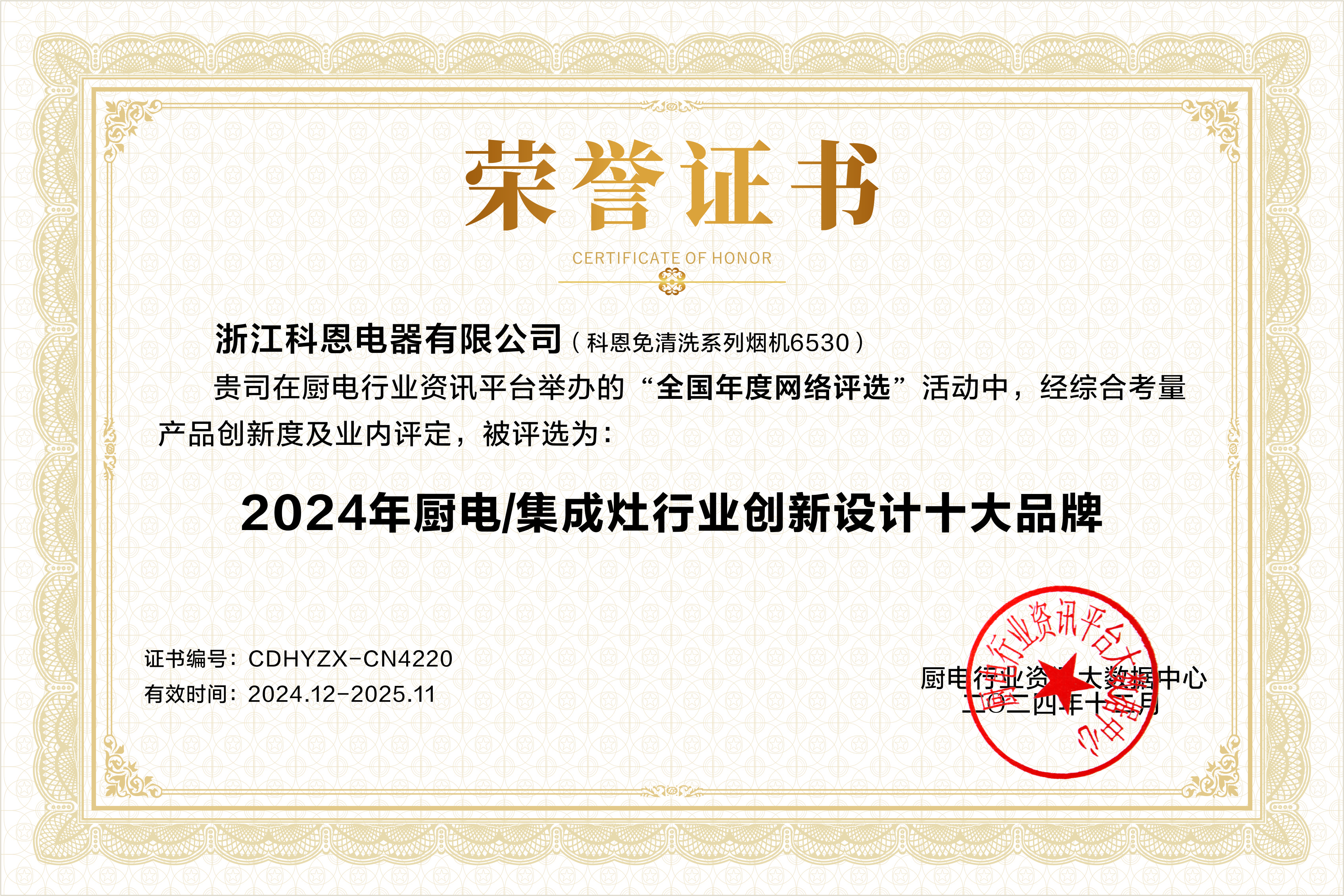 在剛剛過去的2024年,科恩電器更是榮譽加身,榮獲了“2024年廚電行業(yè)影響力十大品牌、消費者好口碑十大品牌、廚電/集成灶創(chuàng)新設計十大品牌等稱號”。這些殊榮不僅是對科恩電器過去一年在產(chǎn)品研發(fā)、品牌建設、市場推廣以及客戶服務等方面所付出努力的高度肯定,更是為其在激烈的市場競爭中贏得了更多的話語權和競爭優(yōu)勢。