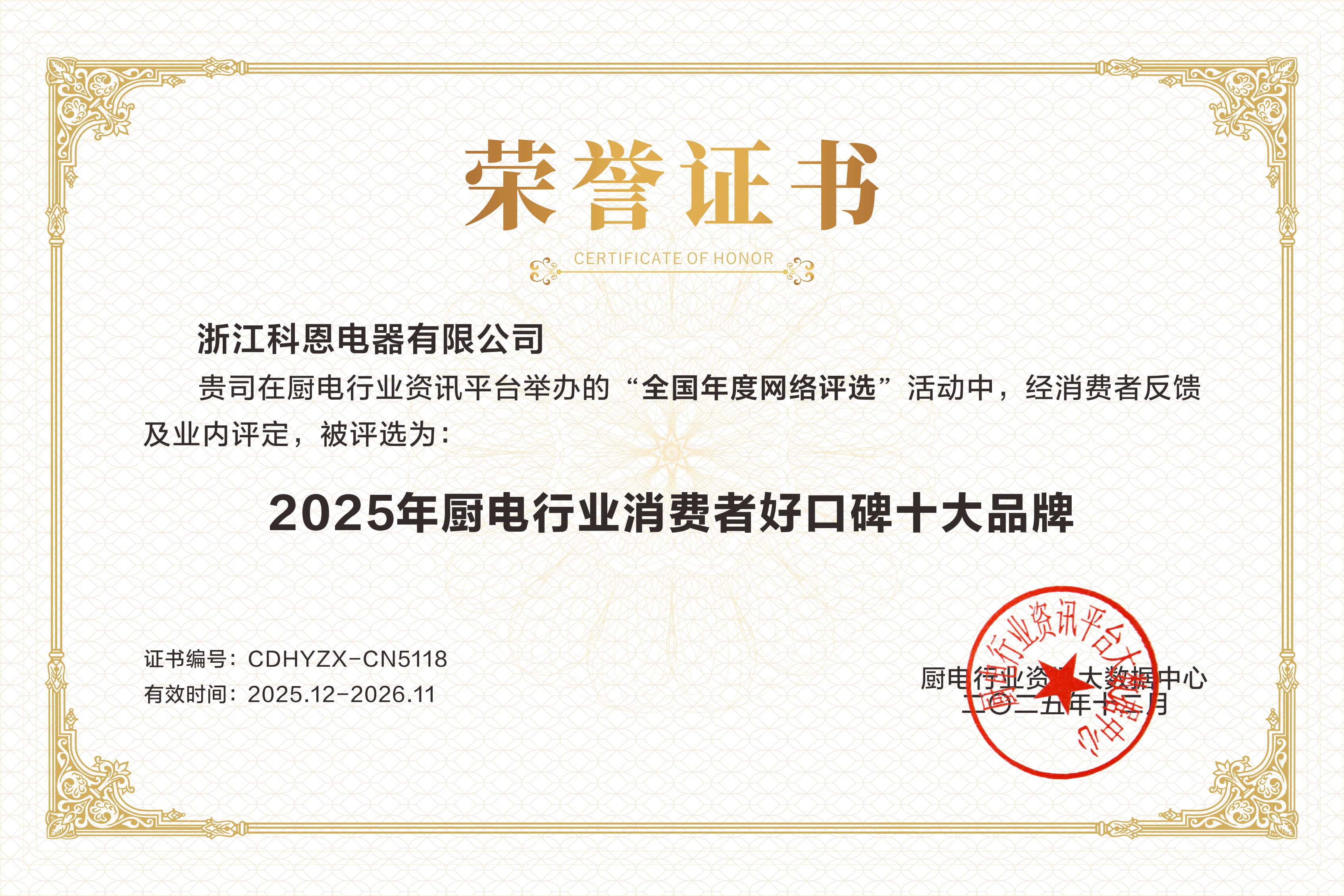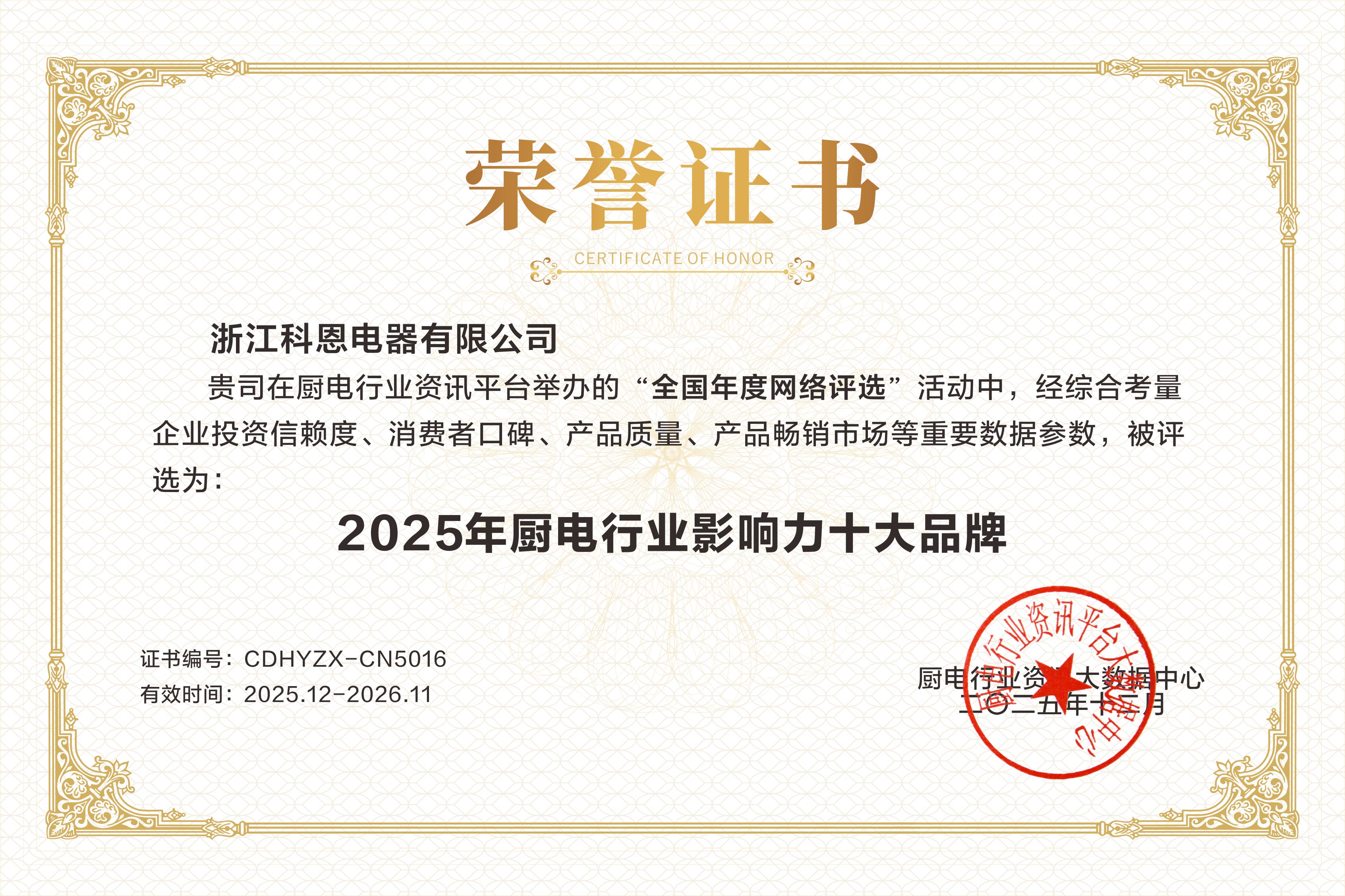 近日,廚電行業(yè)重磅榜單揭曉,科恩電器以卓越實力與口碑,一舉榮獲“2025年廚電行業(yè)影響力十大品牌”與“2025年廚電行業(yè)消費者好口碑十大品牌”雙項大獎。這份榮譽不僅是對科恩電器多年來深耕廚電領域的肯定,更見證了品牌在用戶心中扎根生長的溫暖力量。