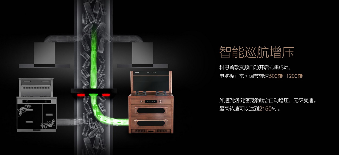 • 科恩首款變頻自動(dòng)開啟式集成灶,無(wú)級(jí)變速。