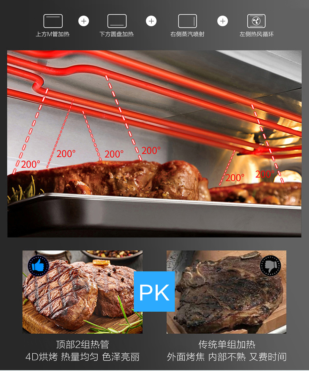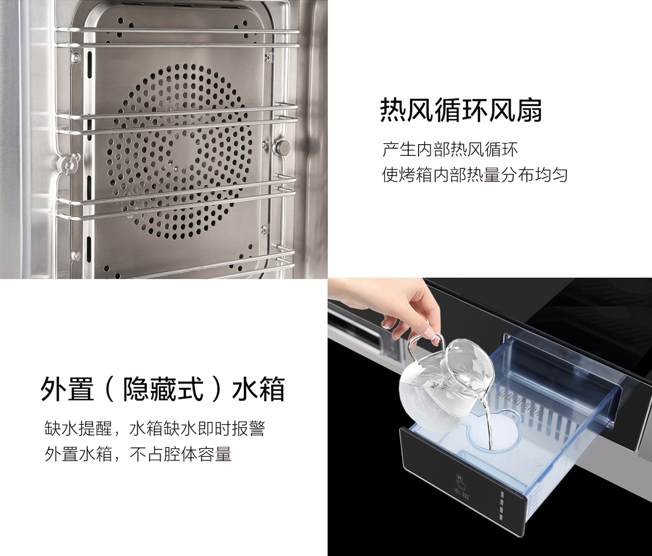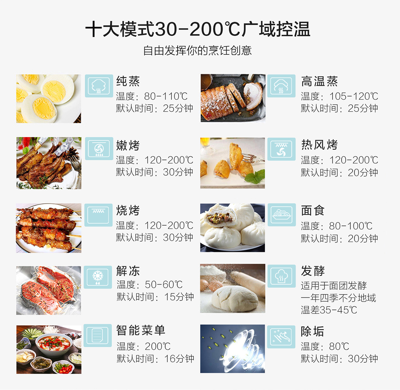 - 62L大容量食品級304不銹鋼內(nèi)膽,上下4層設(shè)計,9種蒸烤模式。