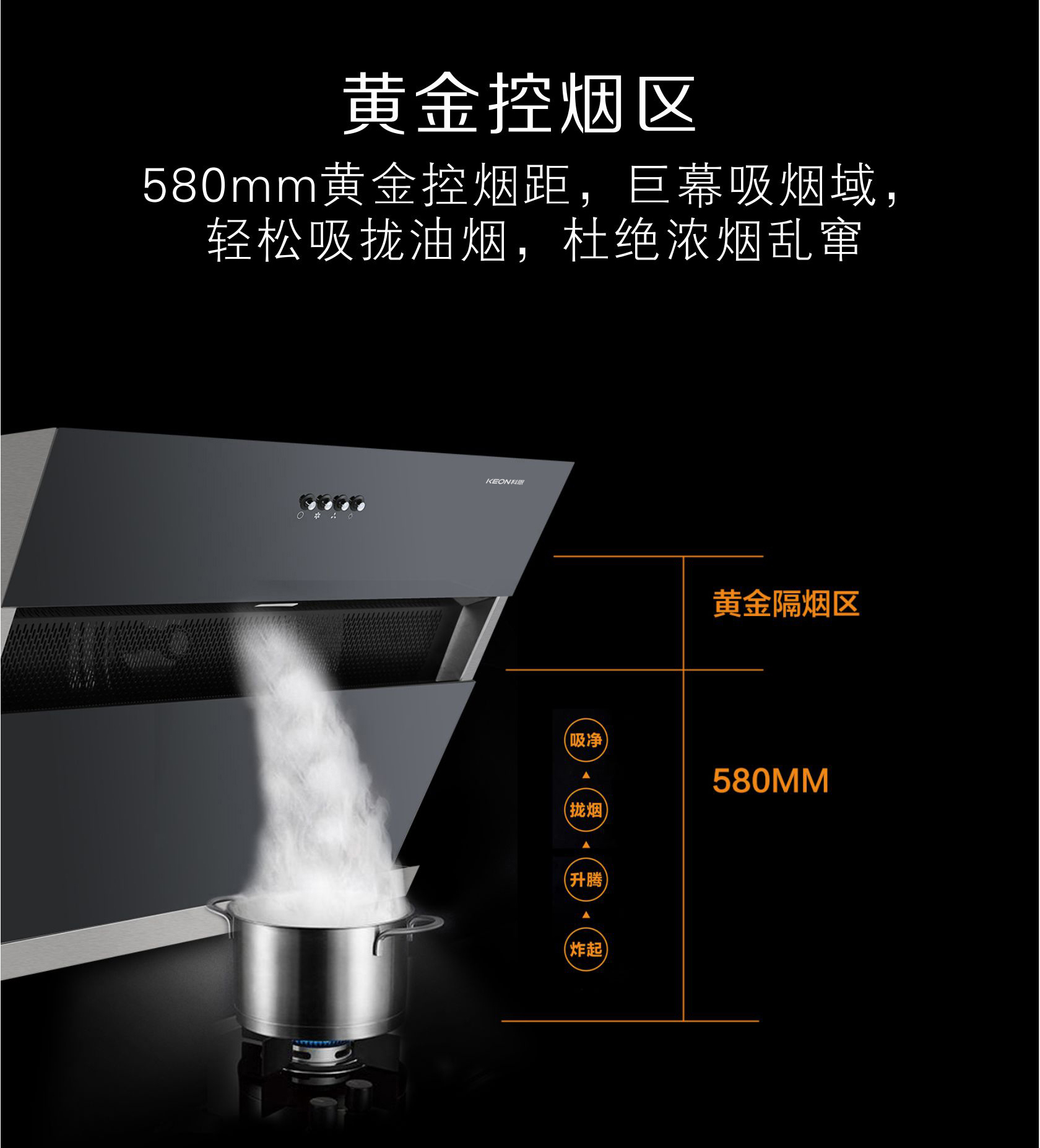 • 580mm黃金控?zé)熅?,巨幕吸煙域,輕松吸攏油煙,杜絕濃煙亂竄。