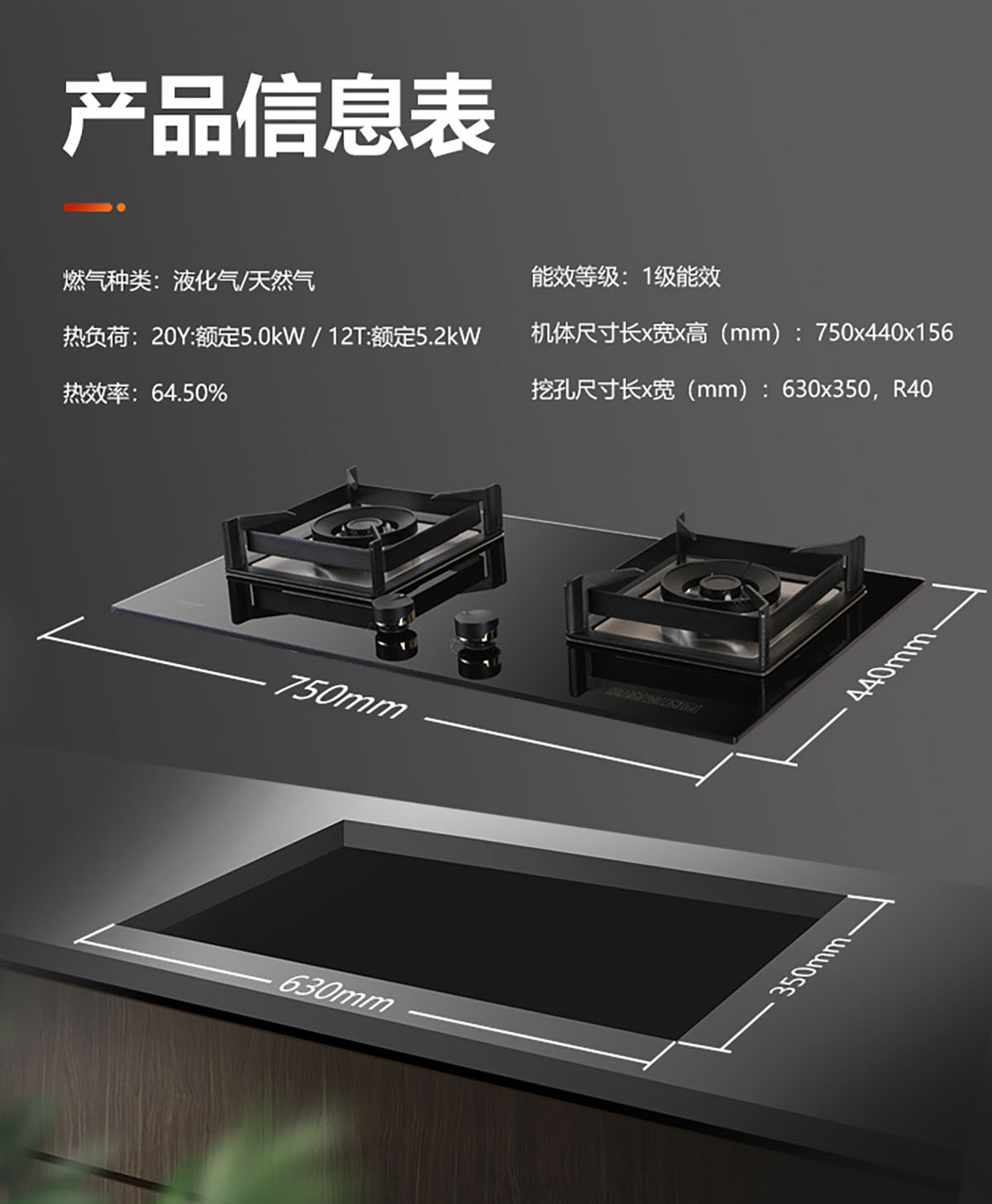 機體尺寸長x寬x高(mm):750x440x156(爐架頂至爐腳底高度)挖孔尺寸長x寬(mm):630x350,R40