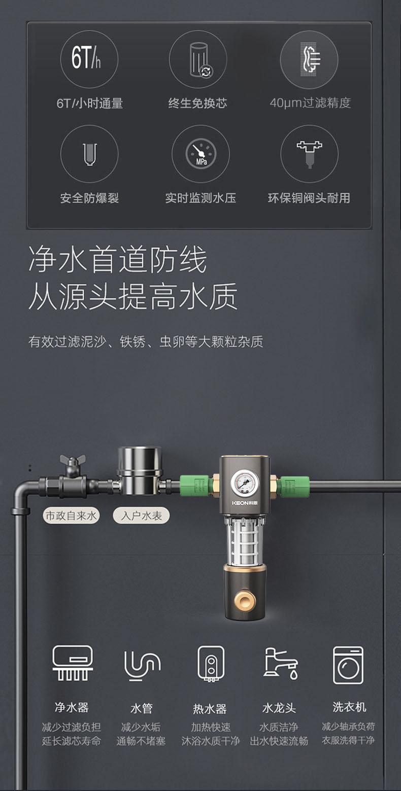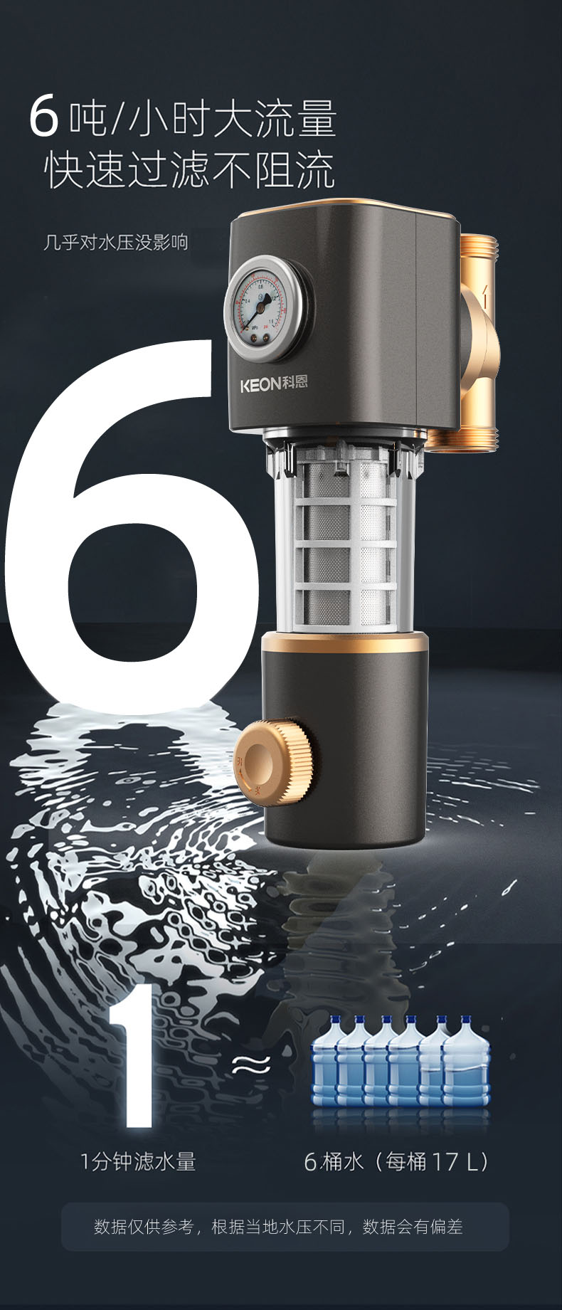 - 6噸/小時(shí)大流量,快速過(guò)濾,全屋用水無(wú)壓力