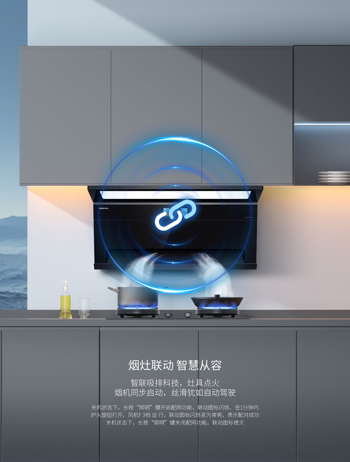 - 風(fēng)隨火啟,煙灶聯(lián)動智慧從容,智聯(lián)吸排科技