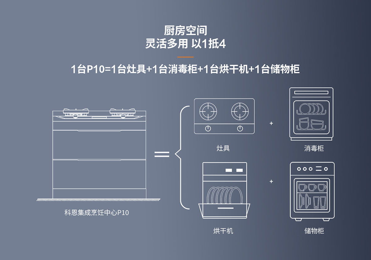 - 以1抵4,1臺(tái)P10=1臺(tái)灶具+1臺(tái)消毒柜+1臺(tái)烘干機(jī)+1臺(tái)儲(chǔ)物柜