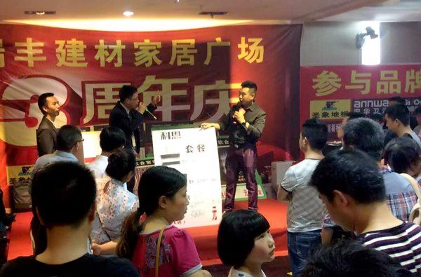 周年慶活動(dòng)現(xiàn)場(chǎng),大批業(yè)主聚集在瑞豐建材家居廣場(chǎng),共同慶祝瑞豐建材3周年的生日。而瑞豐建材為了回饋廣大業(yè)主的厚愛(ài),聯(lián)合全場(chǎng)商家為大家了準(zhǔn)備了精美的禮品與超值的優(yōu)惠。